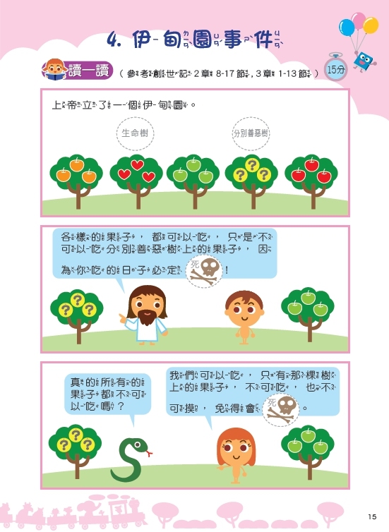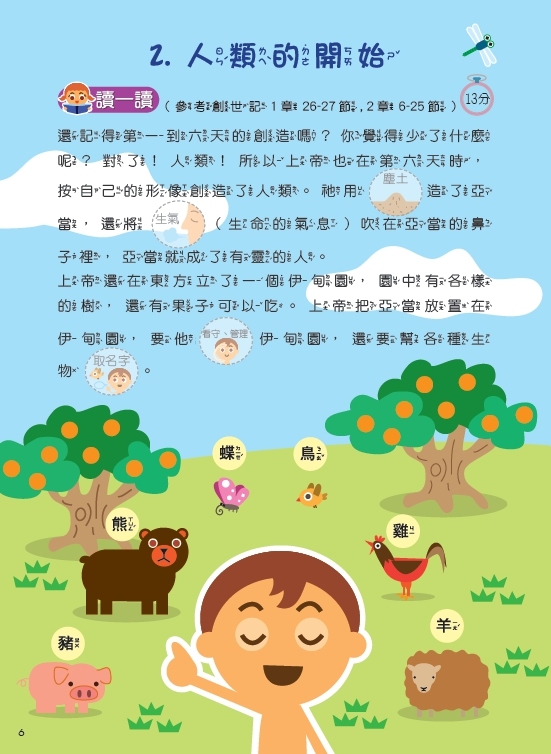 聖經範圍為創世記,帶孩子認識上帝的創造、人類的起源,伊甸園事件,以及介紹亞當後代:挪亞、亞伯拉罕、以撒。
