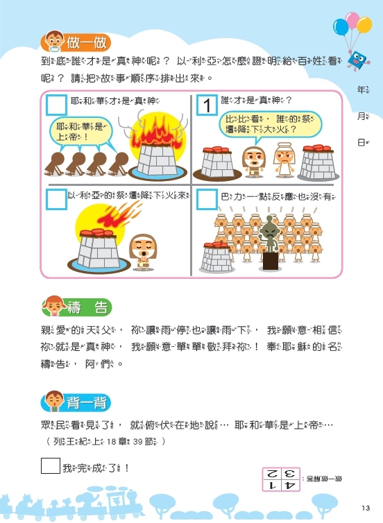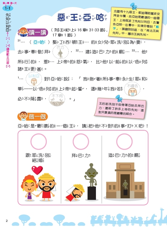 讀一讀:父母帶著孩子細讀一小段聖經,並在關鍵字貼上貼紙,增加印象。