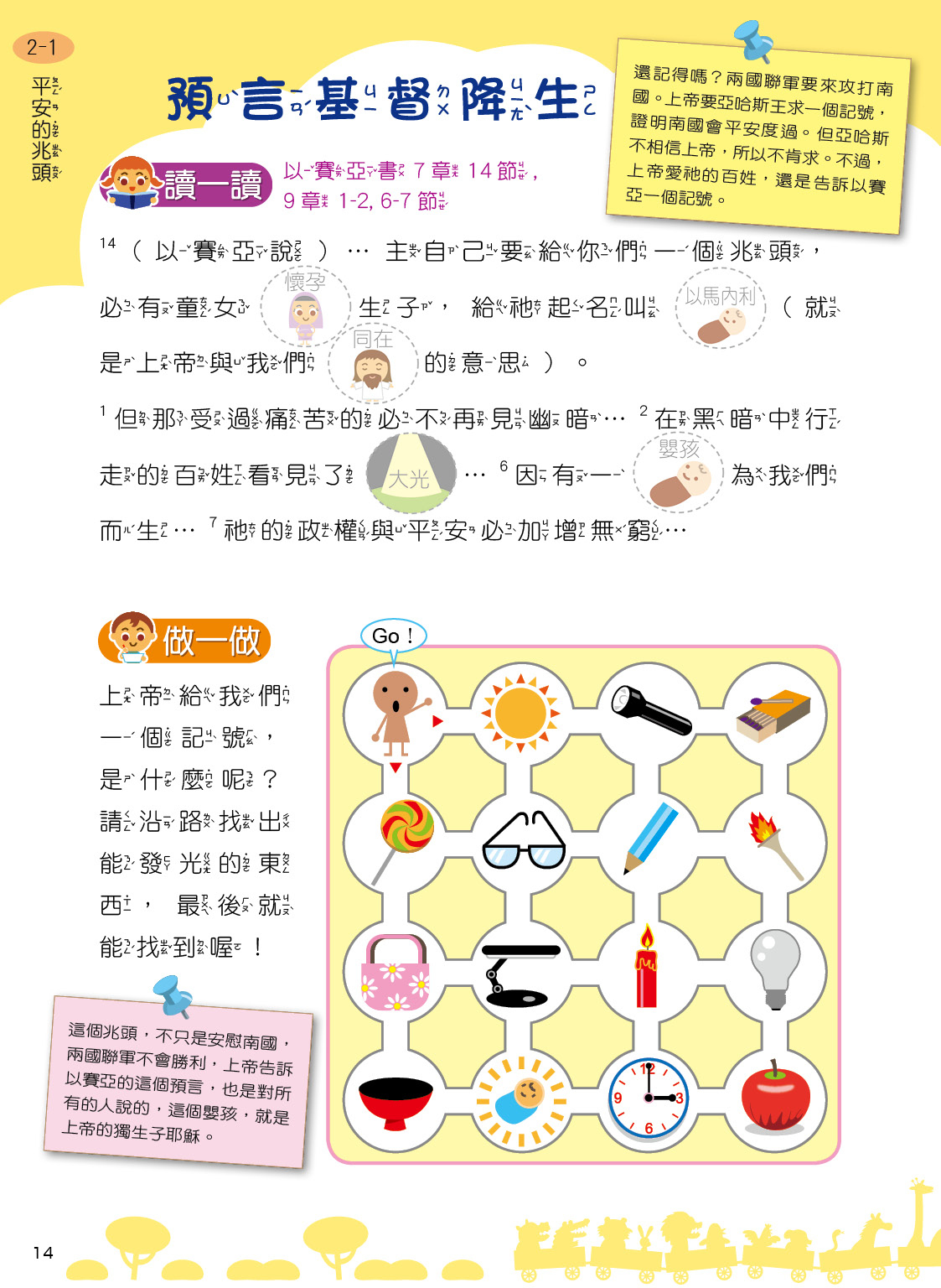 讀一讀:父母帶著孩子細讀一小段聖經,並在關鍵字貼上貼紙,增加印象。