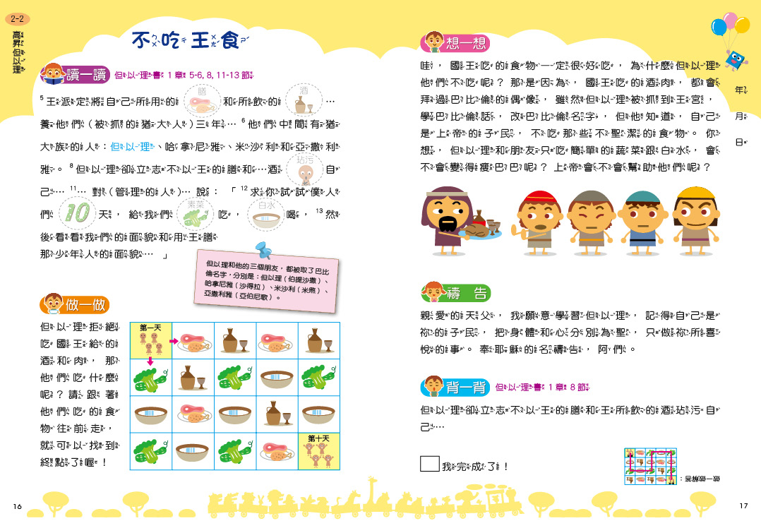 讀一讀:父母帶著孩子細讀一小段聖經,並在關鍵字貼上貼紙,增加印象。