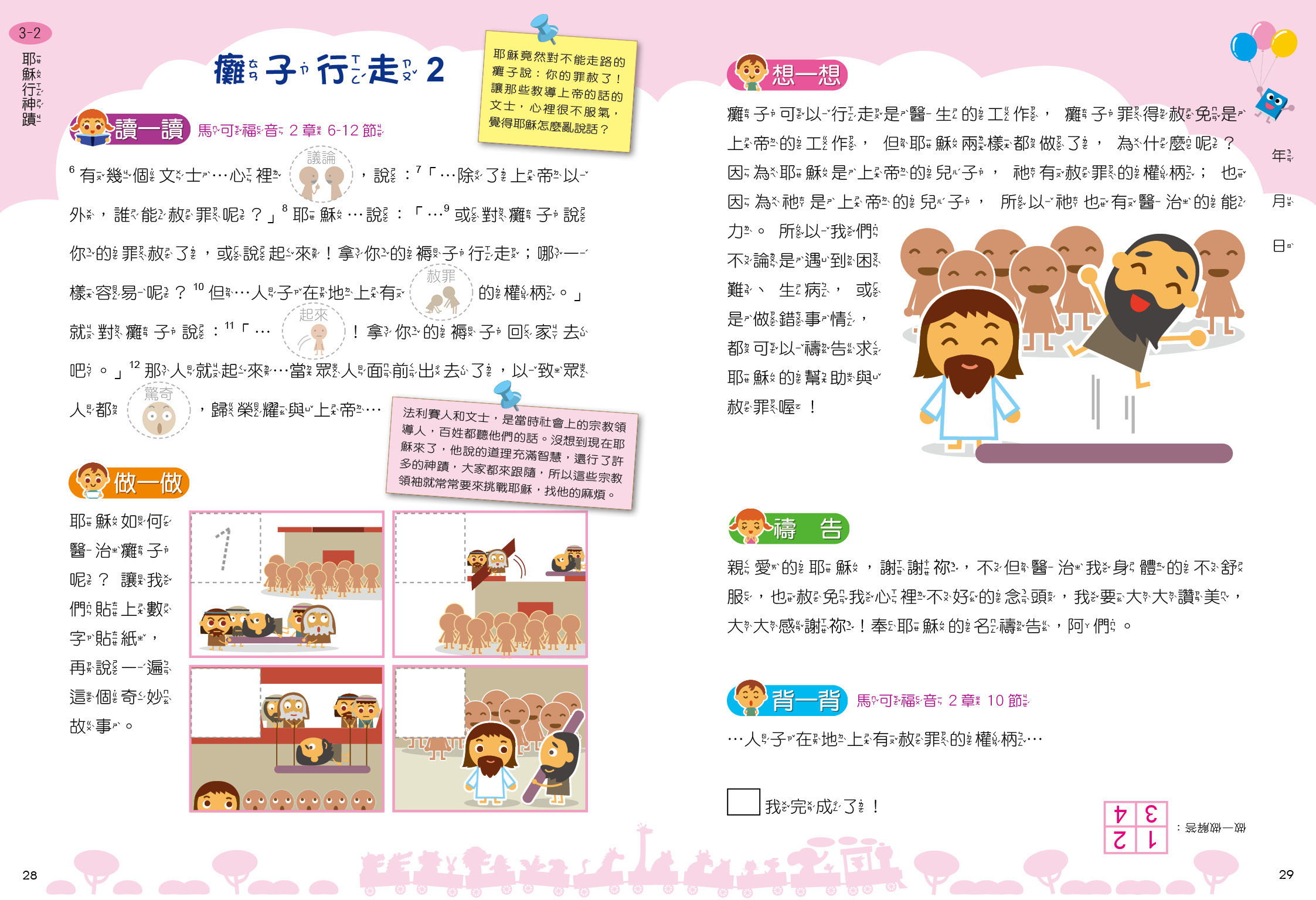 讀一讀:父母帶著孩子細讀一小段聖經,並在關鍵字貼上貼紙,增加印象。